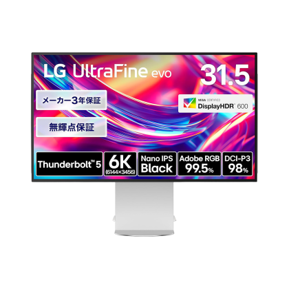 LG UltraFine evo 32U990A-S 319,000円 2025年のCESで「UltraFine 6K」として発表されたLGのモニター。31.5インチで解像度は6K(6144×3456)。Thunderbolt 5に対応し、デイジーチェーンで複数台を束ねた接続が可能。 Amazonで購入